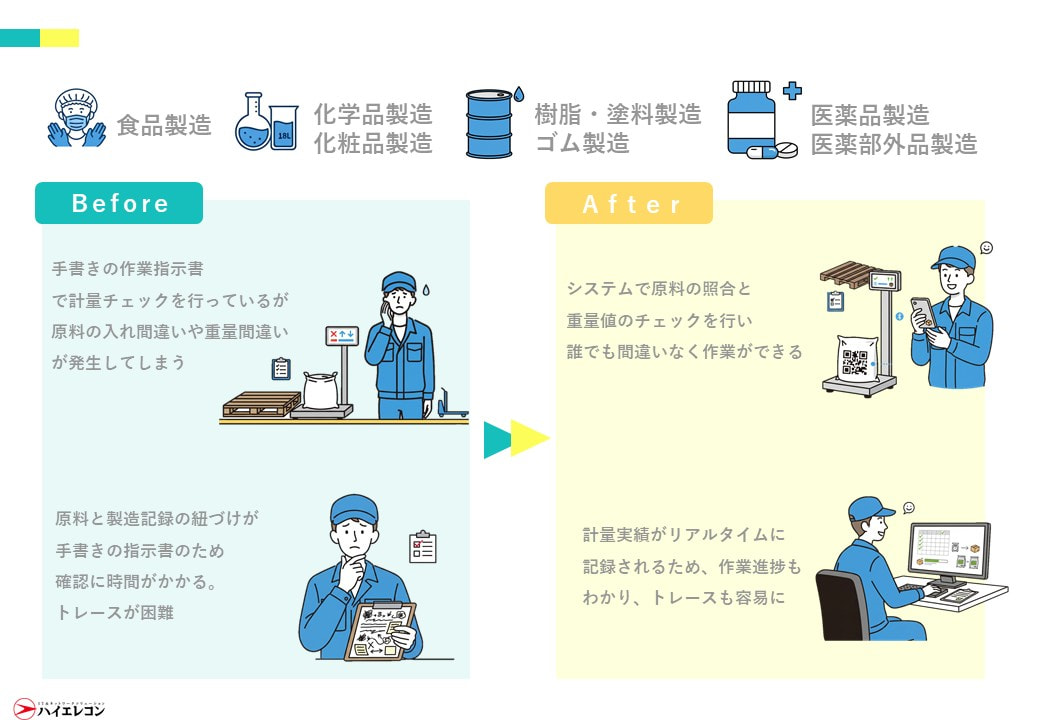 ハカドルは、計量に関わる、原料準備・計量物の投入チェック・残計量・検査や手順の記録・データ集計などの一連の作業をパッケージング。 計量に関わる作業をトータルでスマート化します。